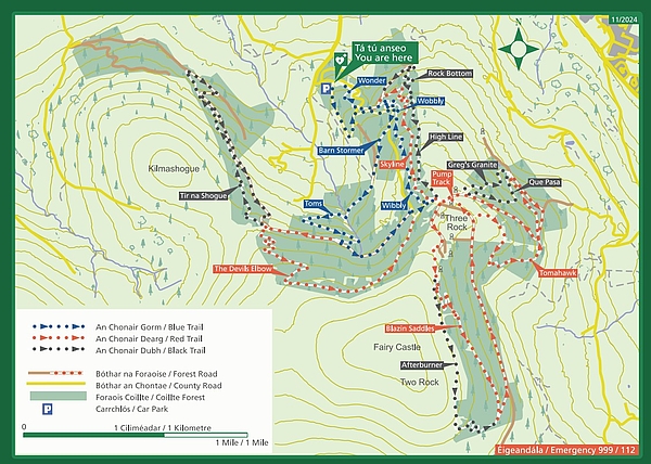 Take care as you exit the car park and follow signs as you climb upwards towards the first descent ‘Barn Stormer’. Following a brief section of forest road, the next trail is ‘Tom’s Climb’. This is the longest section in the trail network which starts with a short descent before a long climb to Kilmashouge forest road. ‘The Devils Elbow’ is the next trail on the Red Loop, fast and rocky with numerous drops and bermed sections.